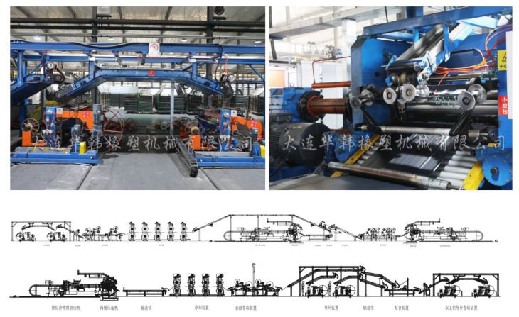 挤出压延法内衬层生产线是子午线轮胎内衬层生产的专用装备,主要用于全钢载重子午胎内衬层和薄胶片的挤出、压延、裁边、冷却、导开、复合、定长裁断和收卷等,既可以生产单条气密层部件,也可以生产复合双气密层部件。